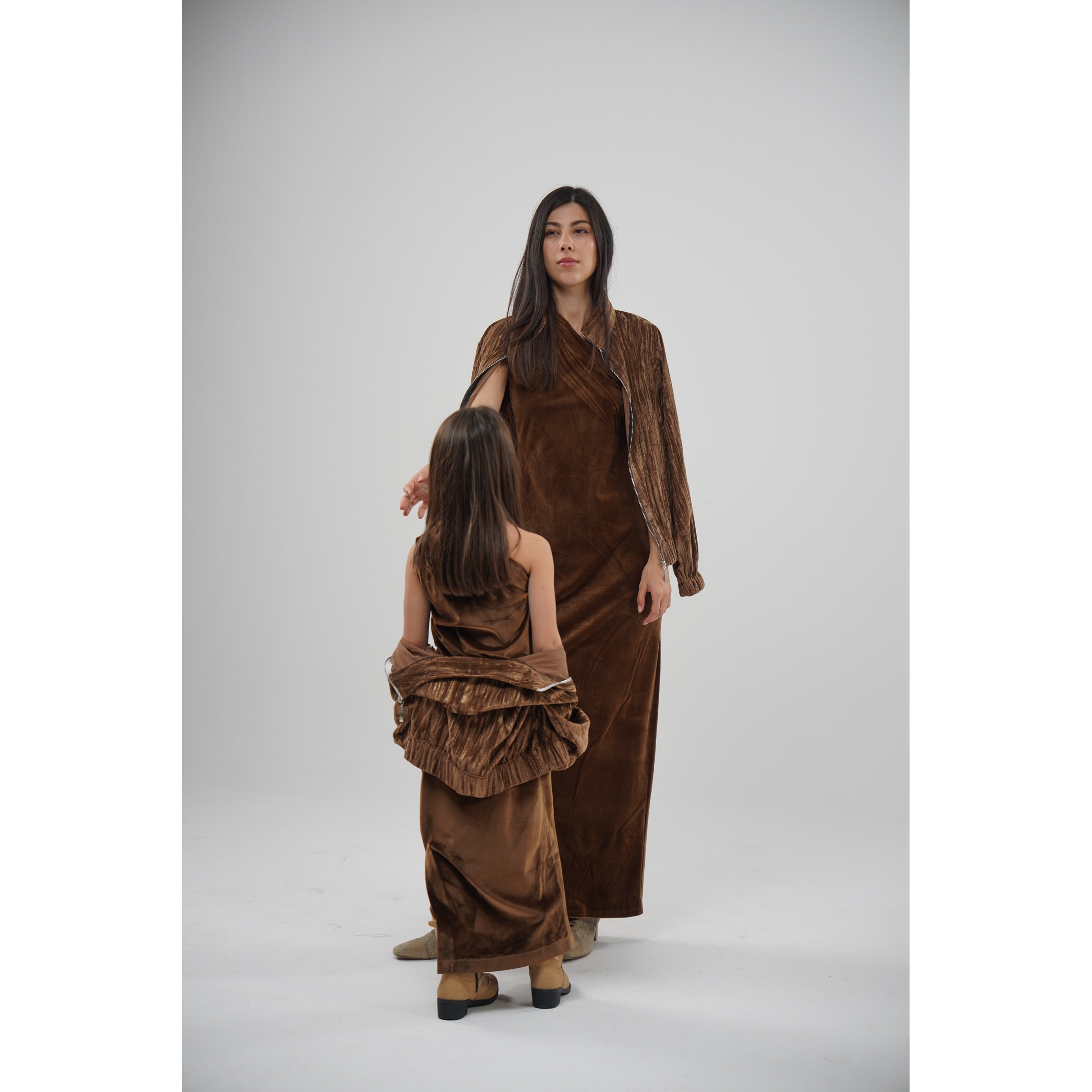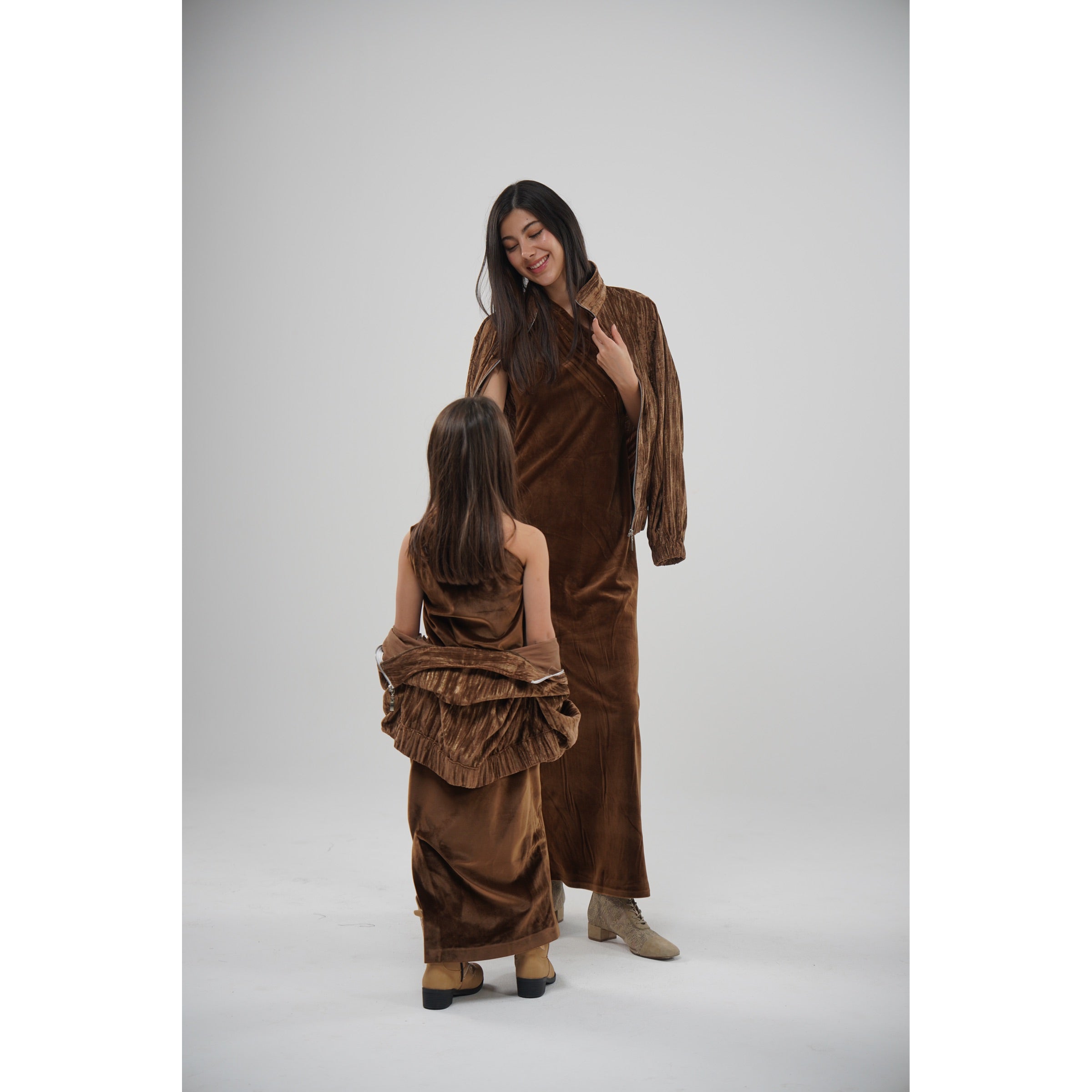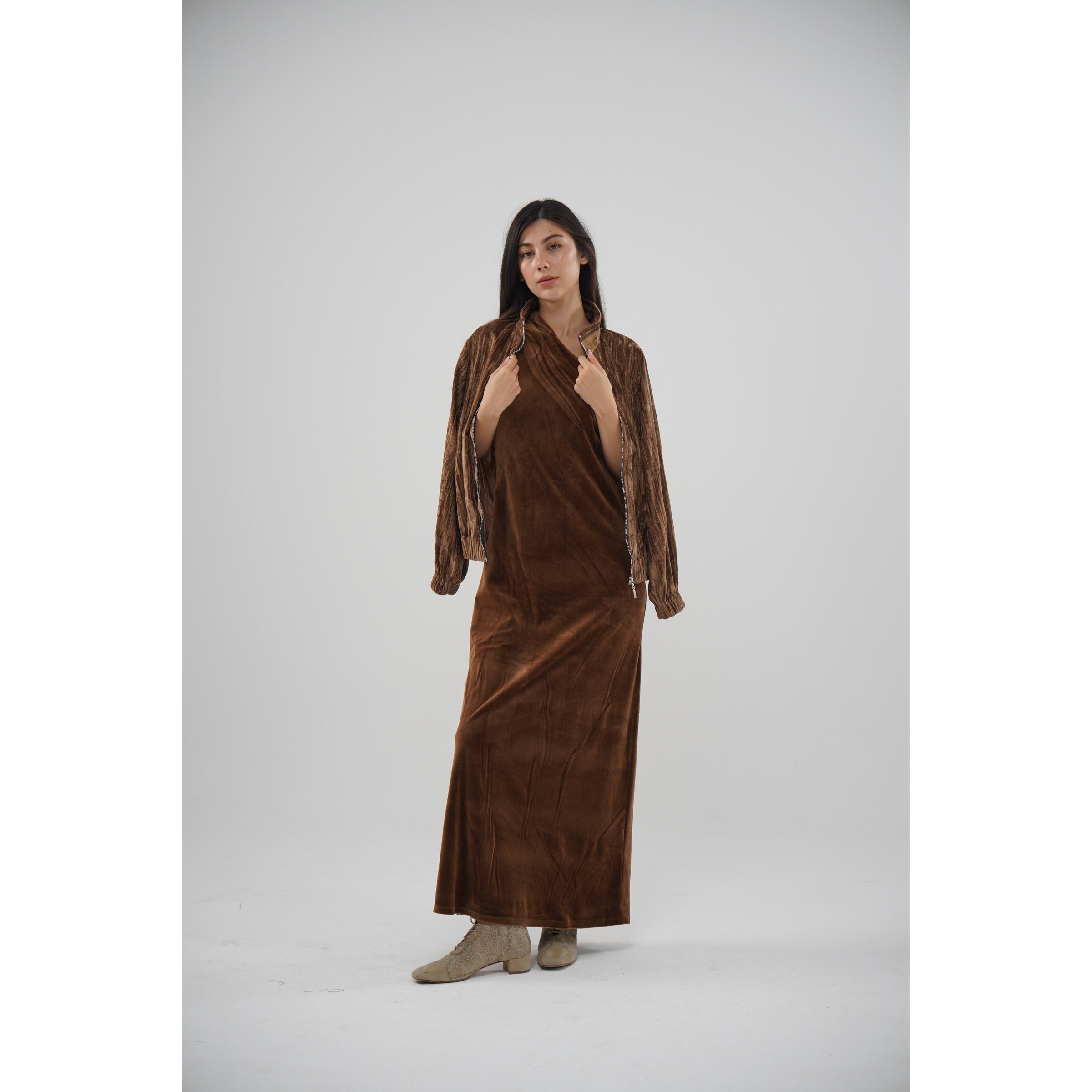دراعه مخمل باللون الموكا مع جاكيت مخمل فيه ذهبي